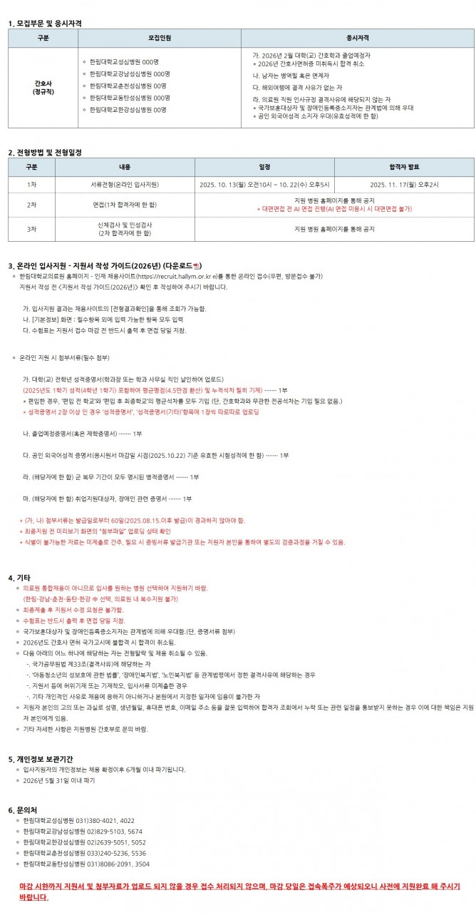 25.10.13 ~ 25.11.222026년도 한림대학교의료원 신입간호사 모집공고