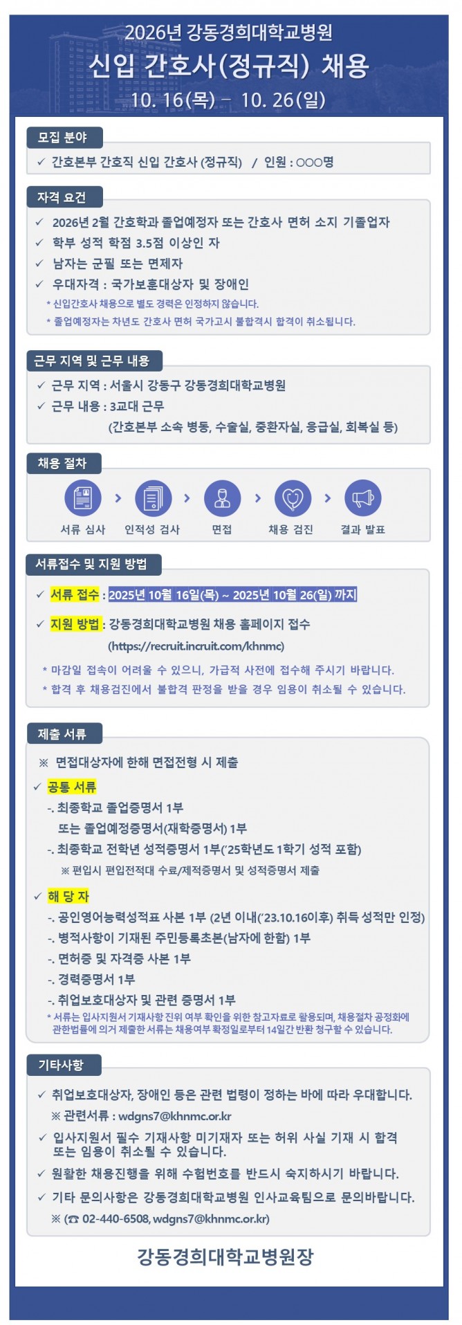 25.10.16 ~ 25.10.262026년 강동경희대학교병원 신입 간호사(정규직) 채용 안내