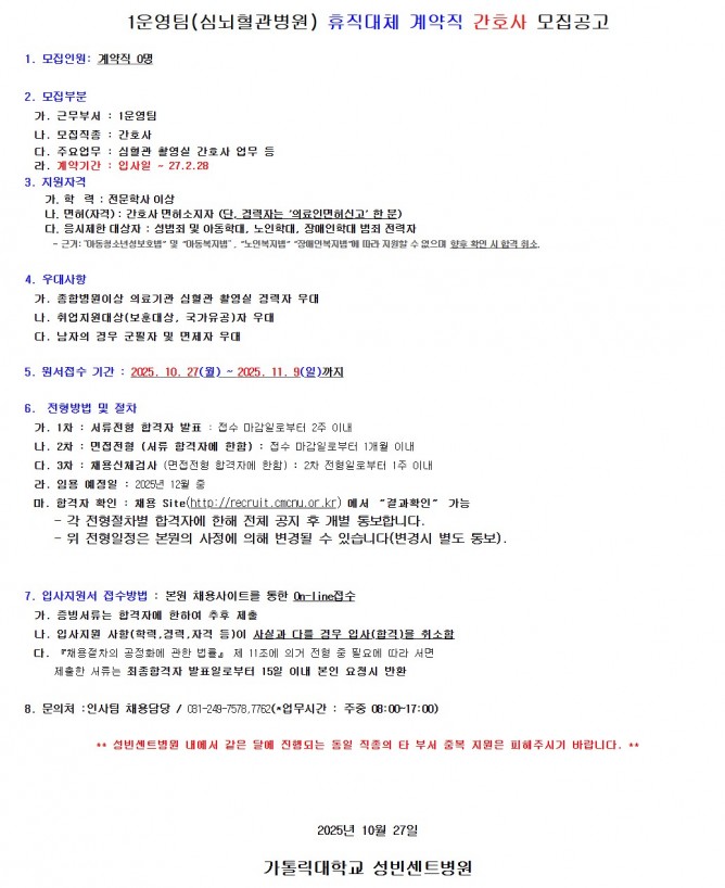 25.10.27 ~ 25.11.091운영팀(심뇌혈관병원) 휴직대체 계약직 간호사 모집공고