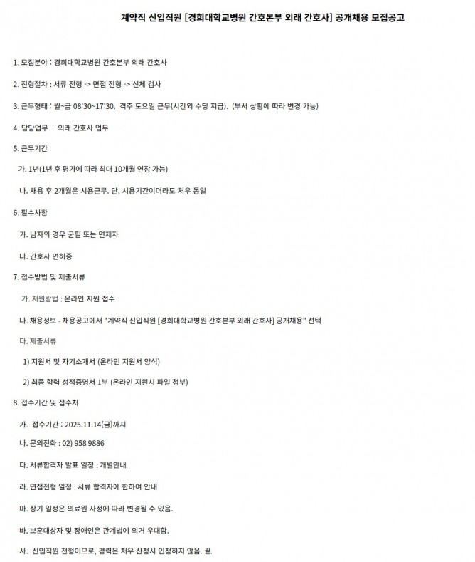 25.10.28 ~ 25.11.14계약직 신입직원 [외래 간호사] 공개채용 모집공고