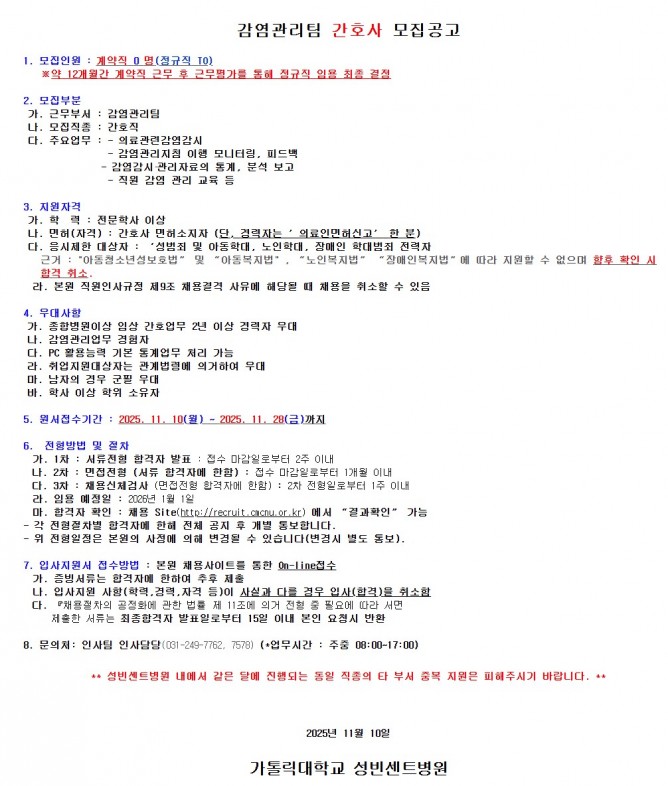 25.11.10 ~ 25.11.28감염관리팀 간호사 모집공고
