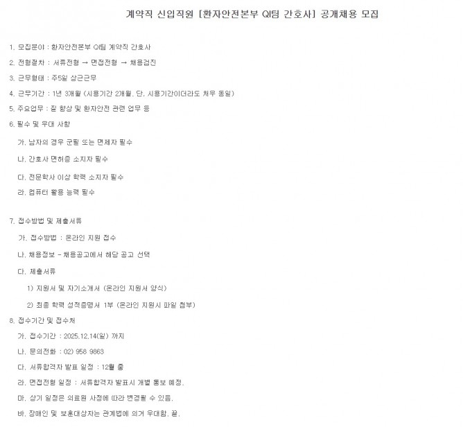 25.12.05 ~ 25.12.14계약직 신입직원 [환자안전본부 QI팀 간호사] 공개채용 모집공고