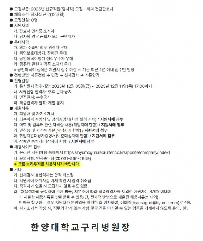 25.12.05 ~ 25.12.11외과 전담간호사 - 2025년 신규직원(임시직) 모집