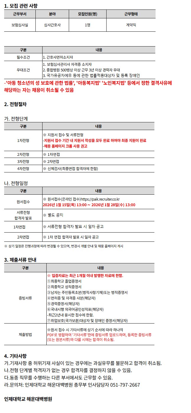 26.01.15 ~ 26.01.28보험심사실 계약직 간호사 채용 공고