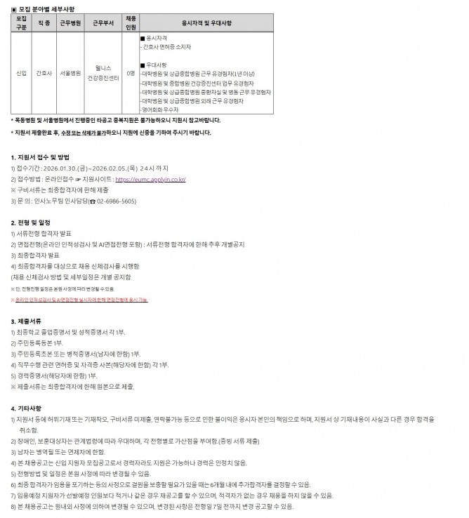 26.01.30 ~ 26.02.05웰니스건강증진센터 정규직 간호사 공개채용 공고