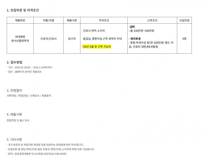 26.02.20 ~ 26.02.24의대병원 방사선종양학과 간호직 간호사(임시직) 채용 안내