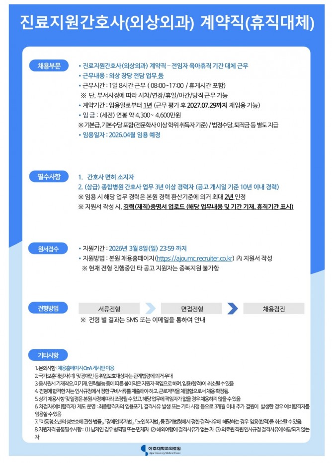 26.03.03 ~ 26.03.08진료지원간호사(외상외과) 계약직(휴직대체)