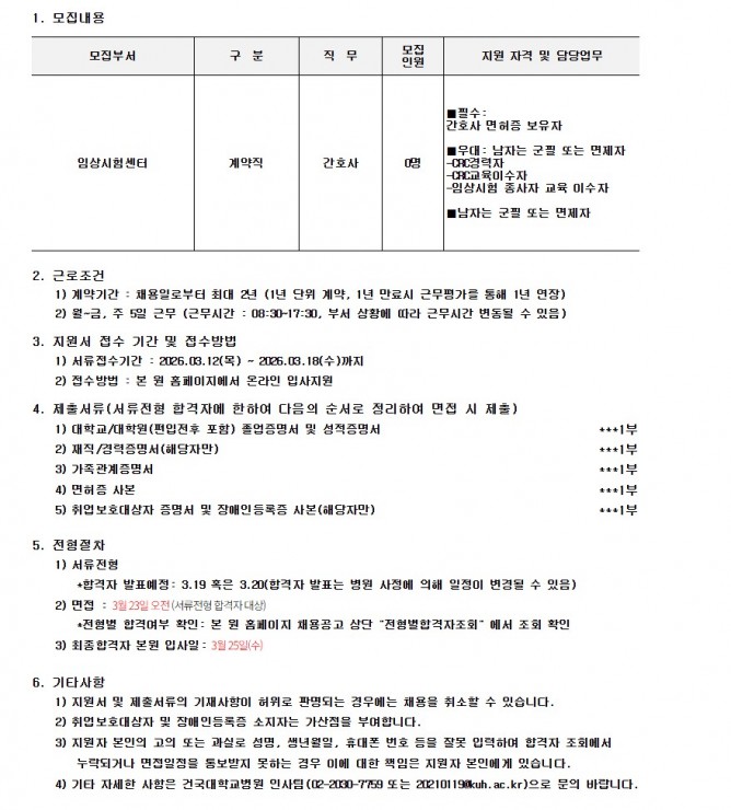 26.03.12 ~ 26.03.18[계약직] 임상시험센터 간호사 채용