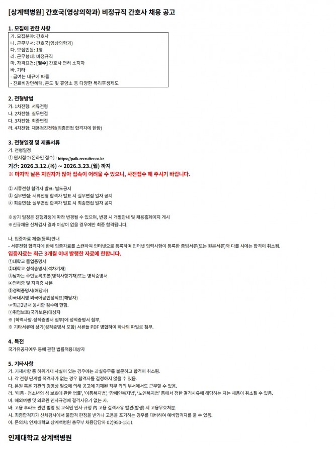 26.03.12 ~ 26.03.23간호국(영상의학과) 비정규직 간호사 채용 공고
