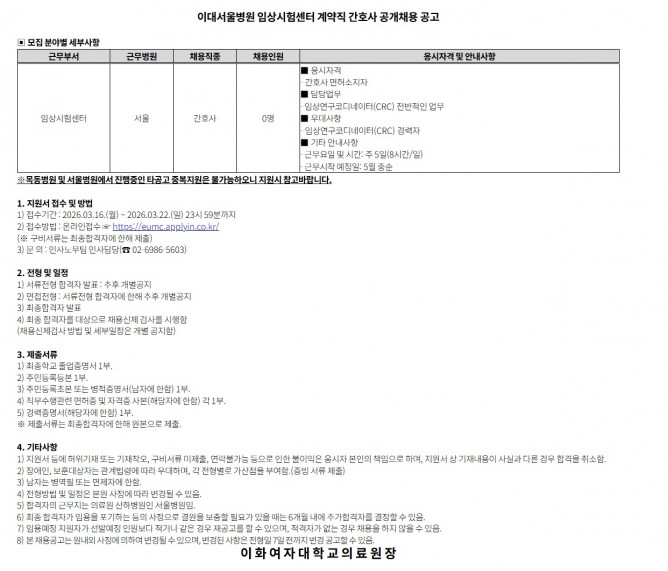 26.03.16 ~ 26.03.22임상시험센터 계약직 간호사 공개채용 공고