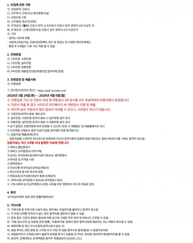 26.03.24 ~ 26.04.06간호국(신생아중환자실) 정규직(경력) 간호사 채용 공고