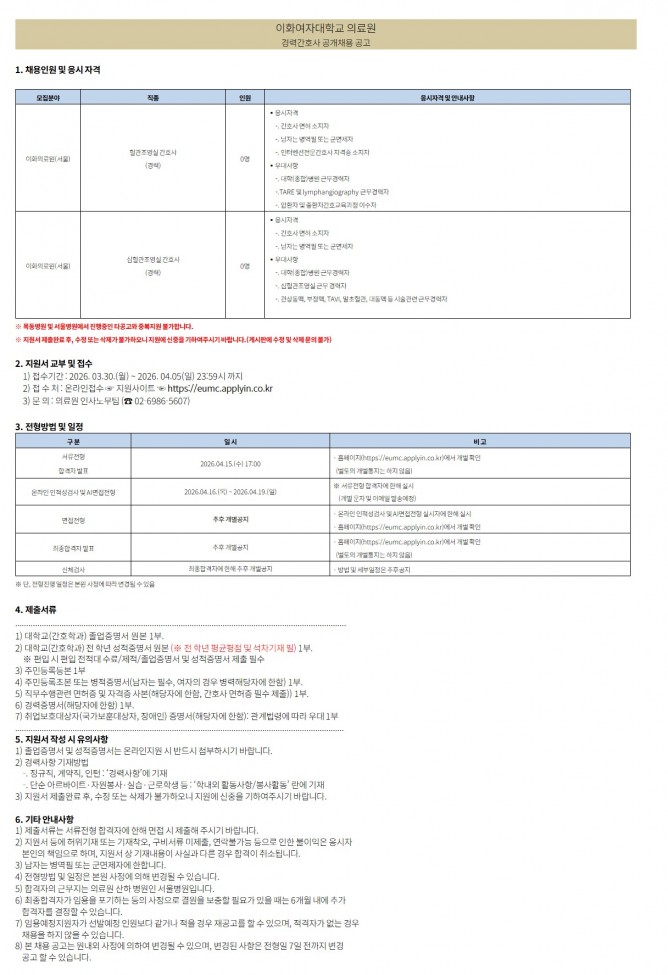 26.03.30 ~ 26.04.052026년 서울병원 간호부 정규직 경력간호사 공개채용 공고(혈관조영실, 심혈관조영실)