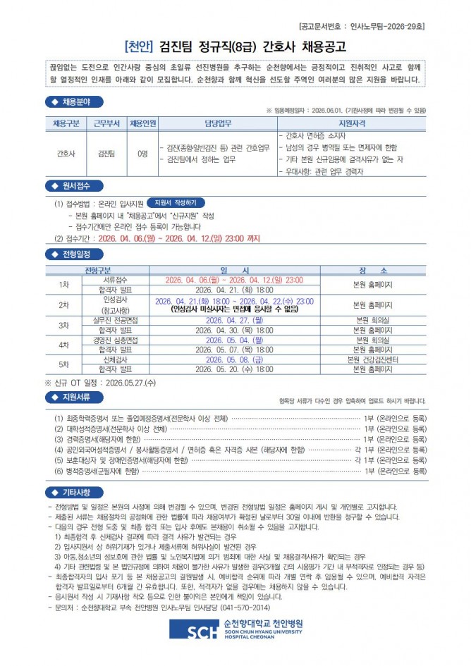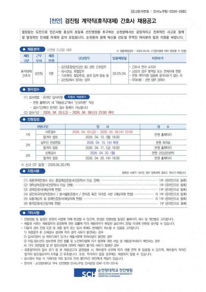 26.04.03 ~ 26.04.07검진팀 긴호사 채용공고