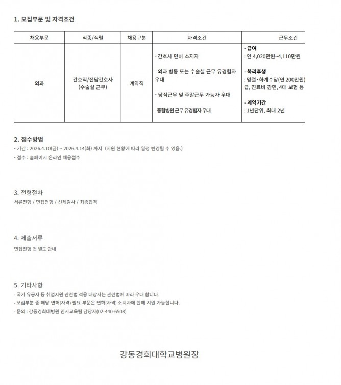26.04.10 ~ 26.04.14외과 간호직 전담간호사(계약직) 채용 안내