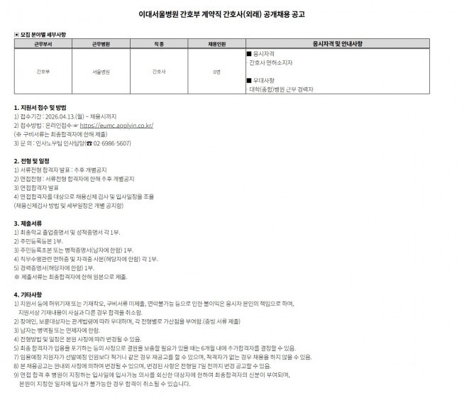 26.04.13 ~ 26.04.19[서울병원] 간호부 계약직 간호사(외래) 공개채용 공고