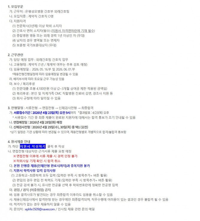 26.04.17 ~ 26.04.23간호부 외래간호팀 간호직 (계약직) 모집(2026-07차)