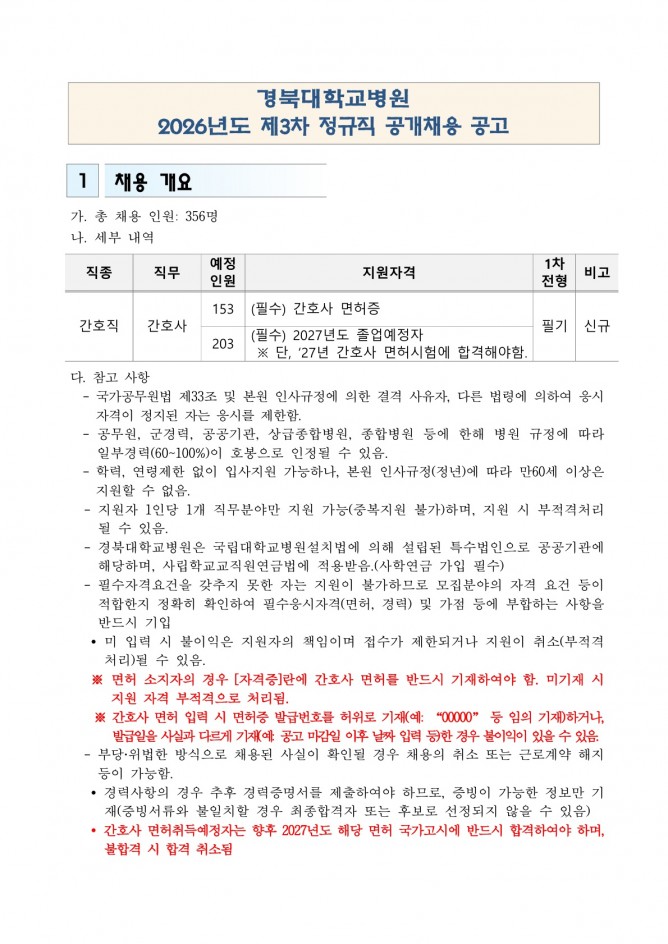 26.04.20 ~ 26.05.042026년 제3차 정규직 공개채용(간호직_'27년 졸업예정자) 공고