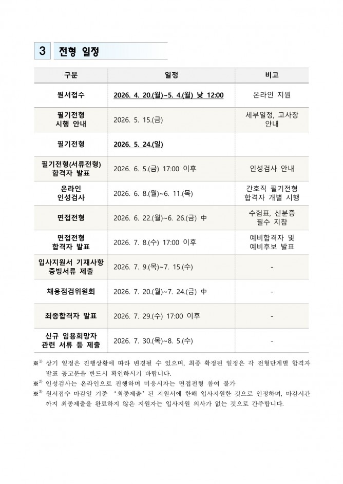 | ※ 마감일은 업체의 사정으로 조기 마감 또는 변경될 수 있습니다. | 지원서류 | ★입사지원서 작성 유의사항.pdf 2026년 제3차 정규직 공개채용 공고문.pdf 간호직 직무기술서.hwp | ||