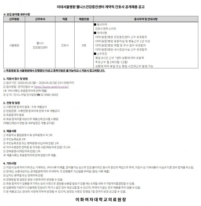 26.04.20 ~ 26.04.26웰니스건강증진센터 계약직 간호사 공개채용 공고