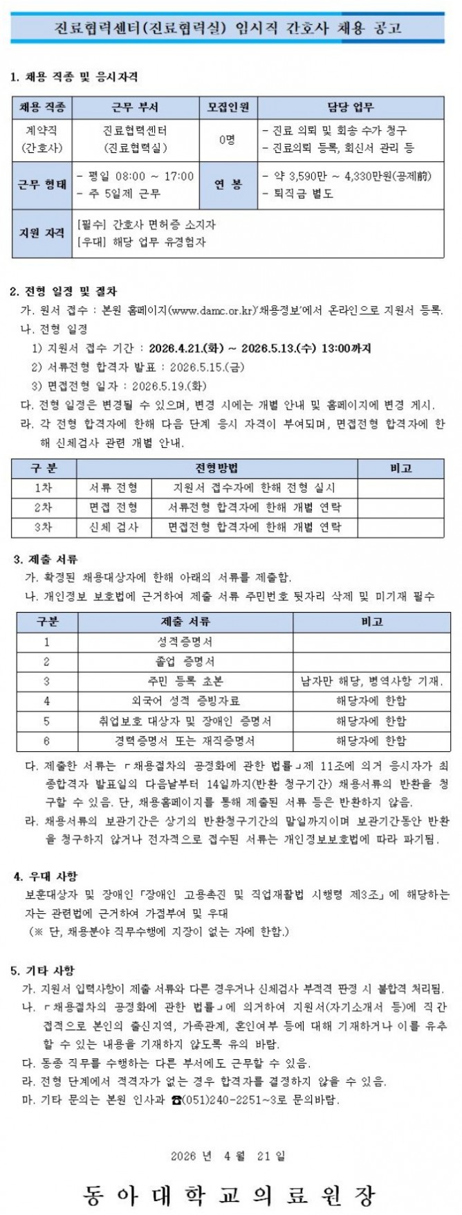 26.04.21 ~ 26.05.13진료협력센터(진료협력실) 임시직 간호사 공개채용 공고