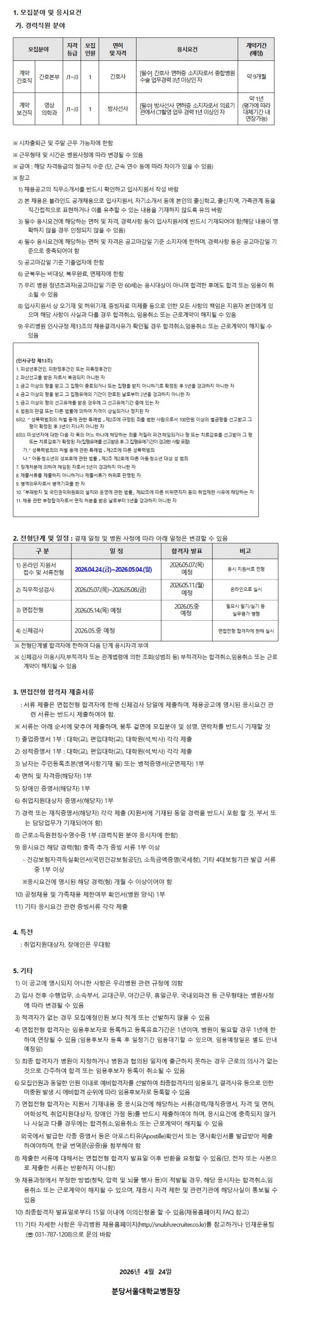 26.04.24 ~ 26.05.04직원(계약간호직, 계약보건직_경력) 채용공고