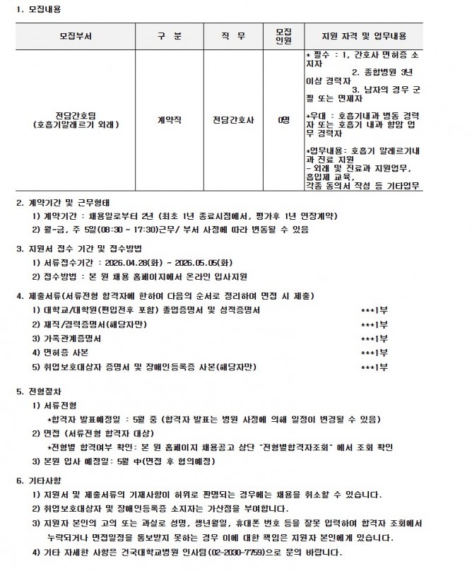 26.04.28 ~ 26.05.05전담간호팀 호흡기알레르기내과(외래) 전담간호사 채용