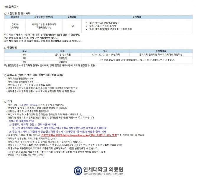 25.11.06 ~ 25.11.12간호사(계약직) 세브)호흡기내과 기관지경검사실 25.11 모집