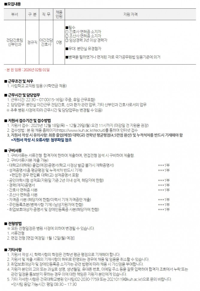 25.12.18 ~ 25.12.29[정규직] 2026년도 조산사 보유 야간전담 간호사 채용