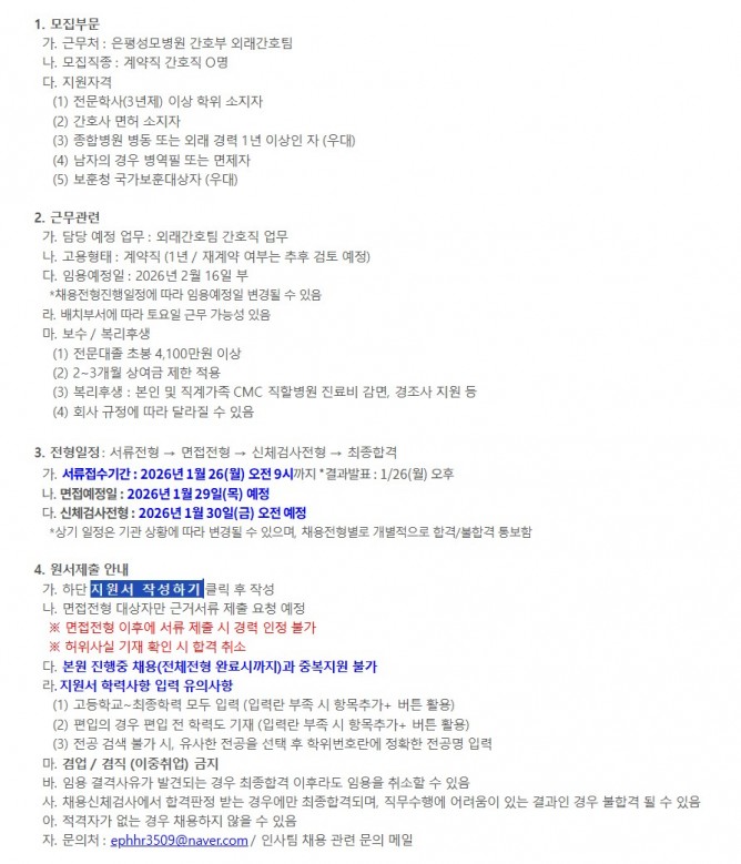 26.01.20 ~ 26.01.26간호부 외래간호팀 간호직 (계약직) 모집