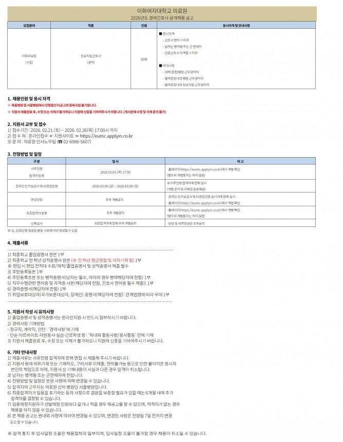26.02.21 ~ 26.02.262026년 서울병원 간호부 정규직 경력간호사 공개채용 공고